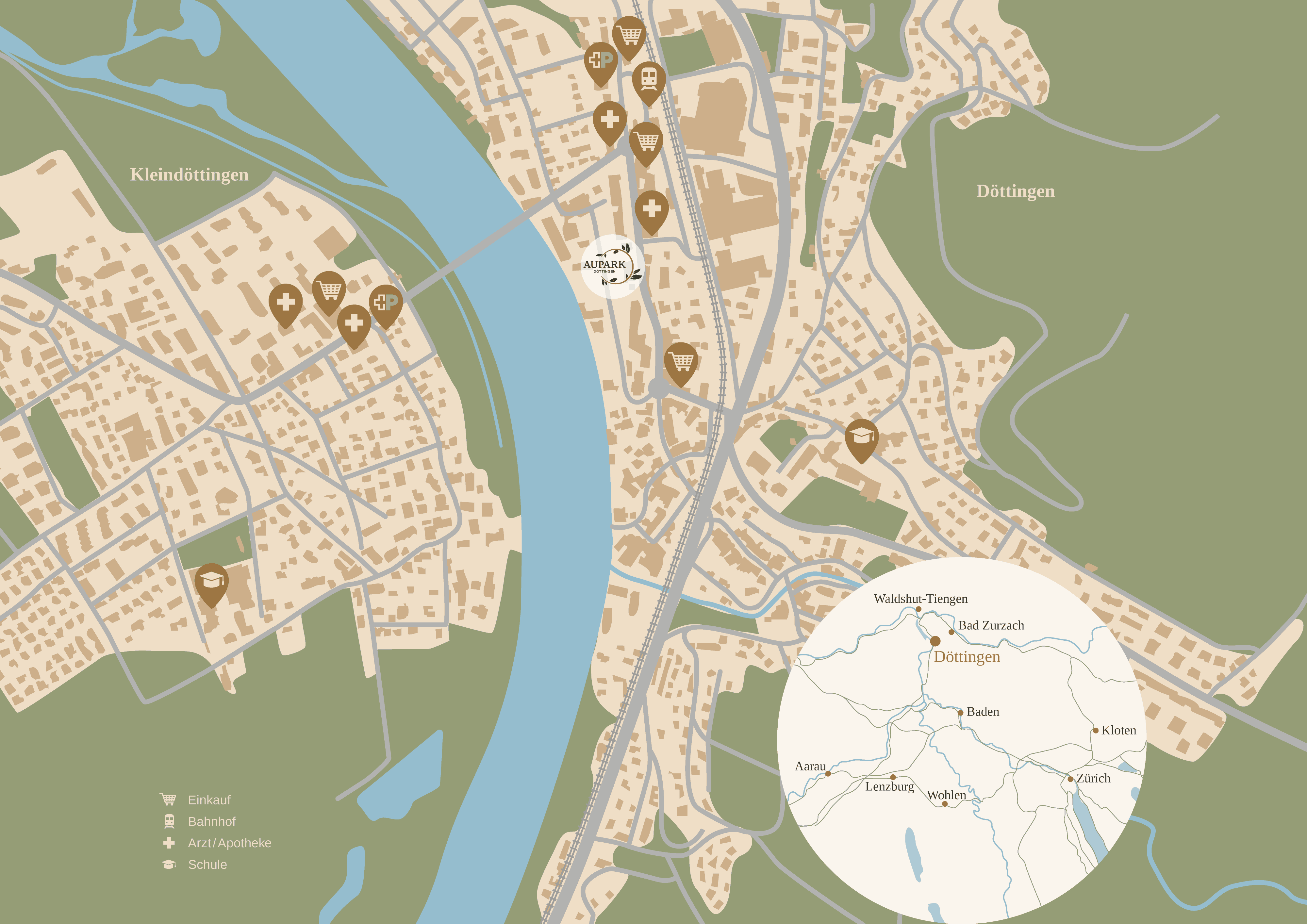 Im AUPARK Döttingen verschmelzen Design, Komfort und Natur zu einem Ort mit besonderer Ausstrahlung. Vier elegante Wohnhäuser bilden ein stilvolles Ensemble mitten im Dorf. Die hochwertige Bauweise nutzt die vorzügliche Lage optimal. Die nach Südwesten orientierte Architektur fängt das Licht und die Wärme des Tages ein, während die Nähe zur nur wenige Meter entfernten Aare Ruhe und Erholung verspricht. So entsteht ein Zuhause, das die zentrale Lage zum Dorfleben und die Ruhe eines naturnahen Quartiers auf einzigartige Weise verbindet.